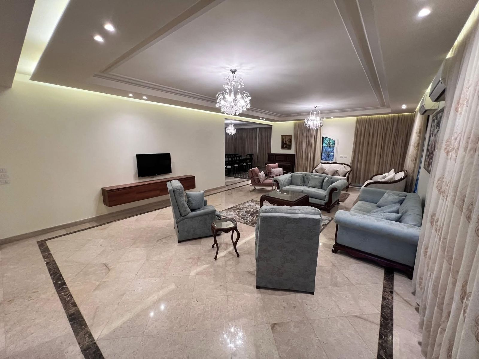 الڤيلا بها ليڤنج مزود بأوفيس وبها غرفة لاندرى مزوده بغساله ومجفف .. الڤيلا مفروشه بالكامل وبها أجهزه ومكيفات